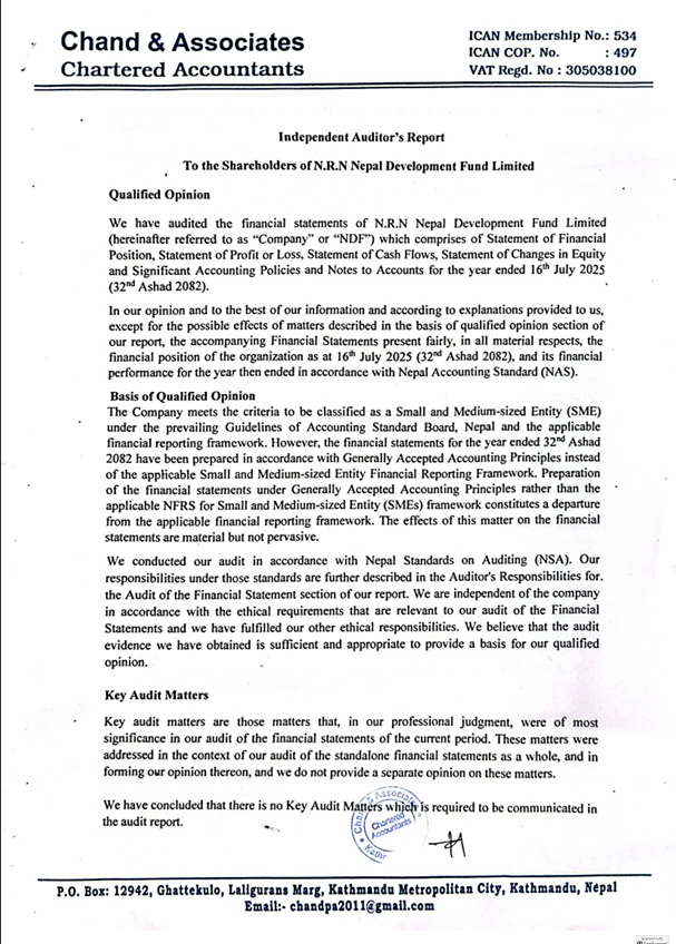 Our FinancialsWe are a limited liability company with an authorized and issued capital of 10 billion NPR. Financial Statements of N.R.N Development Fund LimitedFiscal Year 81/82 Download Financial Statements of N.R.N Development Fund LimitedFiscal Year 79/80 Download Financial Statements of N.R.N Development Fund LimitedFiscal Year 80/81 Download Financial Statements of N.R.N Development Fund LimitedFiscal Year 78/79 Download WHO WE AREAbout Us Our Vision Our Goals Corporate Governance Leadership QUICK LINKSWhat We Do Sustainability Acts and Regulations FAQs Facebook Twitter Linkedin